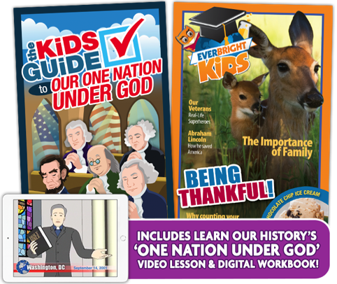 This fun and free gift bundle includes "The Kids Guide to Our One Nation Under God" and the latest issue of the brand-new EverBright Kids magazine, and you get them both for just $1 s&p each!